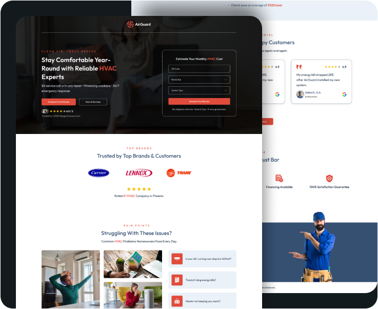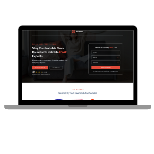 We built a streamlined HVAC landing page with clear service categories, upfront benefits, and a bold “Schedule an Estimate” CTA. The new design highlighted AirGuard’s certifications, energy-saving solutions, and flexible payment options, making it easy for customers to trust and book.