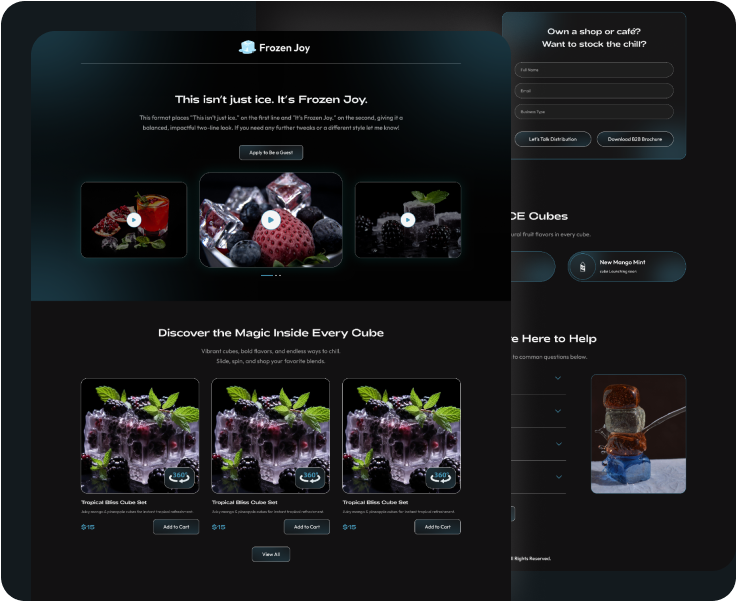 Frozen Joy creates premium flavored ice cubes that keep drinks cold without dilution, adding flavor and fun to every occasion. They needed a landing page that showcased their product’s unique appeal and made buying simple.