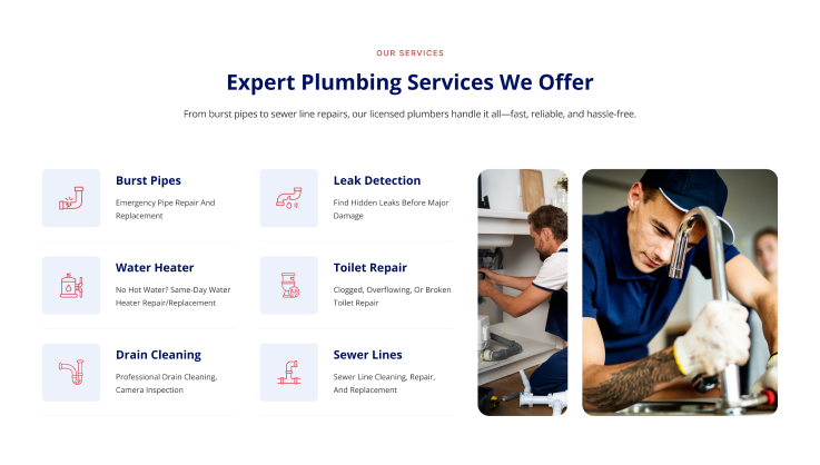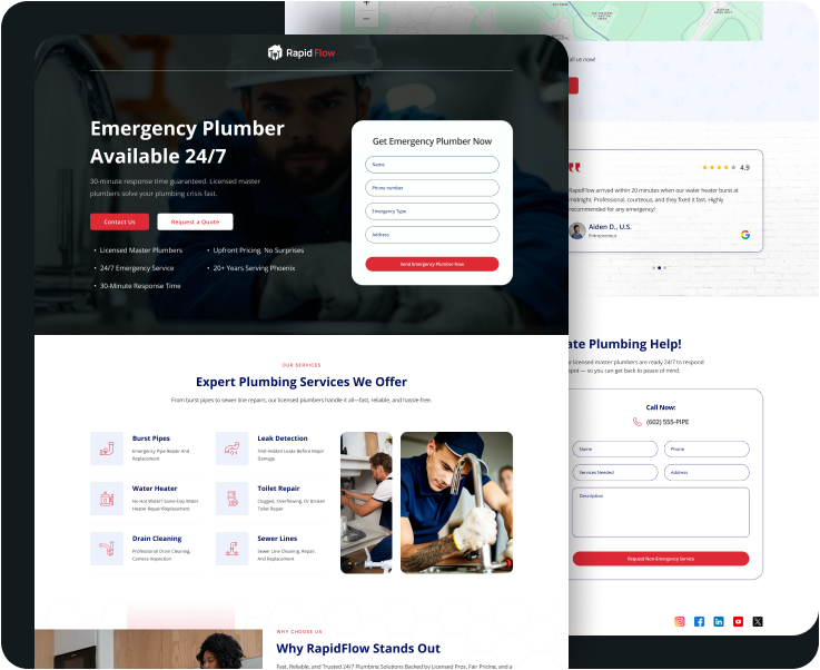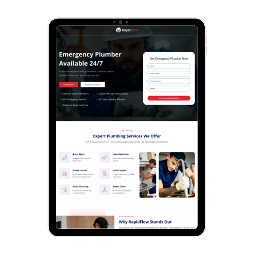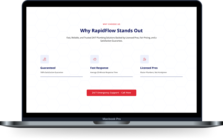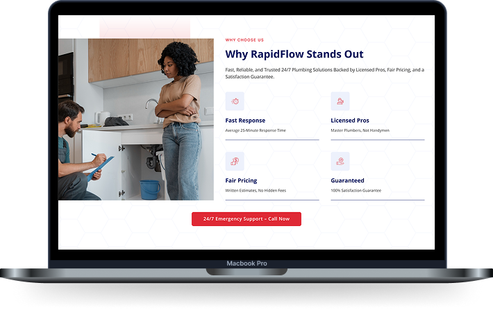 RapidFlow is a local plumbing company known for fast response and expert repairs. Their old site mentioned these strengths but buried them in text-heavy blocks. Visitors facing an emergency weren’t reassured enough to pick up the phone.
